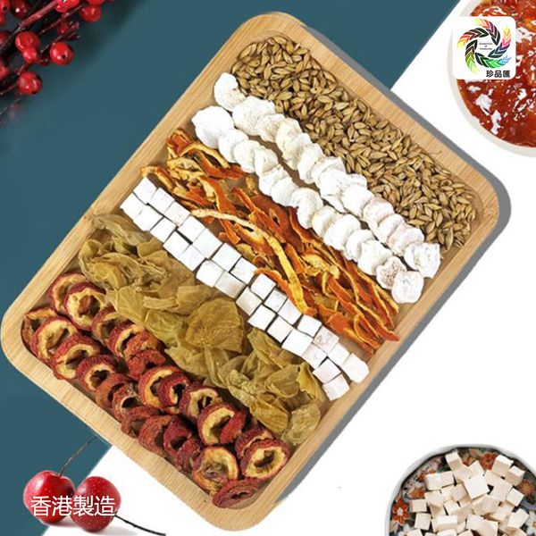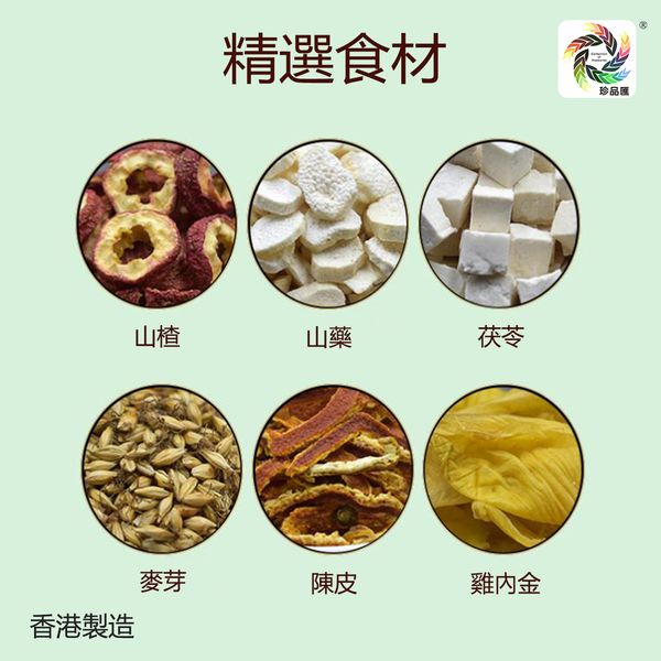 成分有山楂、紅棗、冰糖、山藥、麥芽(含麩質的殼類)、雞內金、甘草、茯苓、陳皮