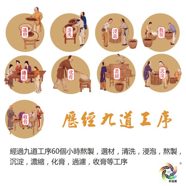 千挑萬選黑桑椹、紅棗、圓肉、淮山、杞子、茯苓、麥芽、荷葉、陳皮、冰糖等上品天然材料,經九道工序60小時濃縮熬製而成,每一道工序都必不可少,由選材、沖洗、浸泡、熬製、沉澱、濃縮、化膏、過濾、收膏,才能真正熬出一樽好的膏。