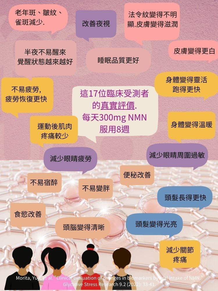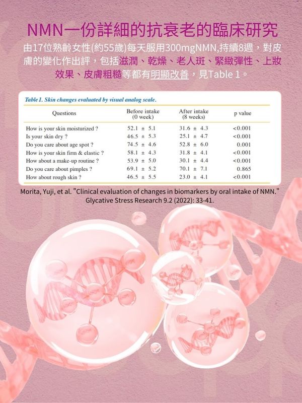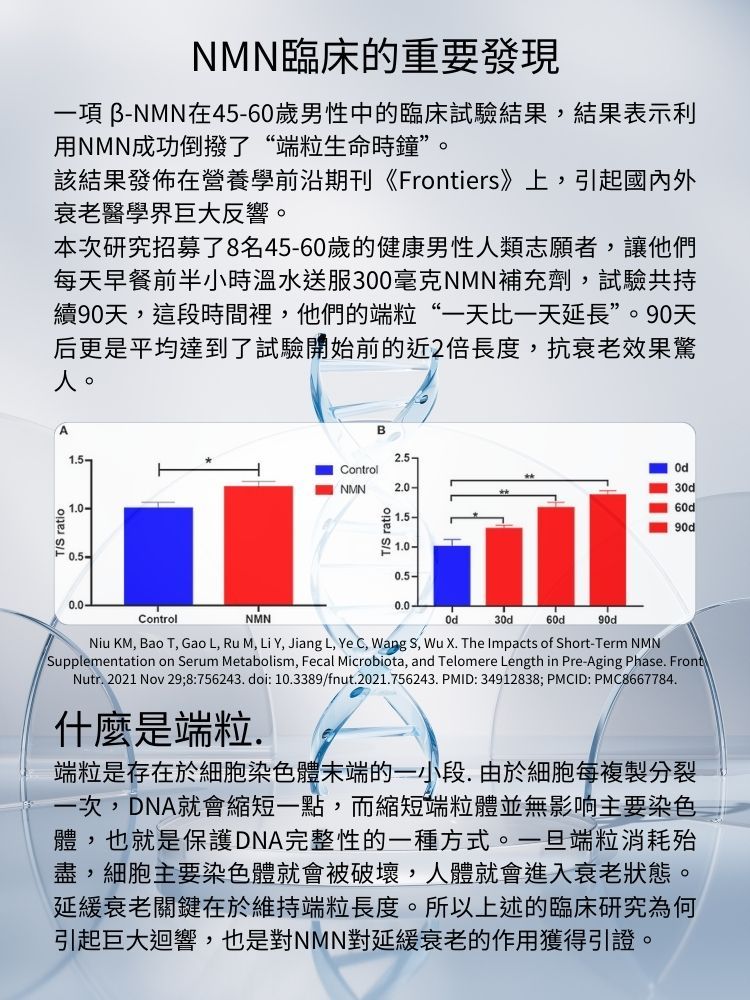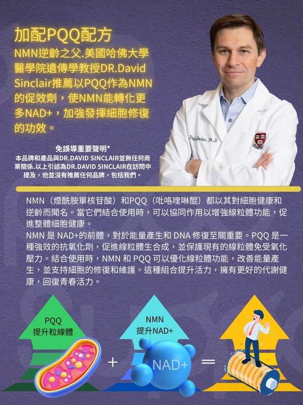 每粒膠囊含有300mg上述的高活性β-NMN及10mg 同樣是生物發酵技術的PQQ,PQQ作為促效劑,促進NMN轉化為NAD+的效率,並加強細胞修復的功效。