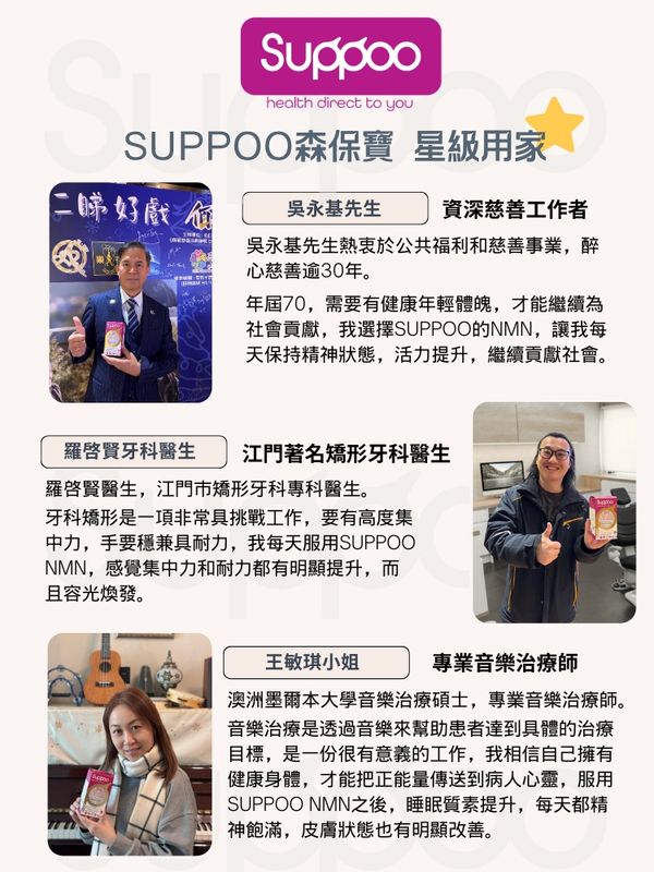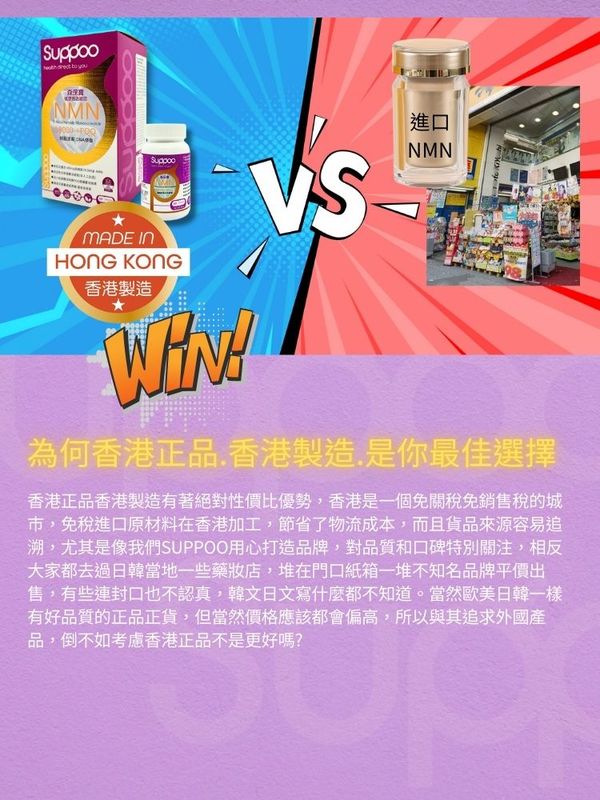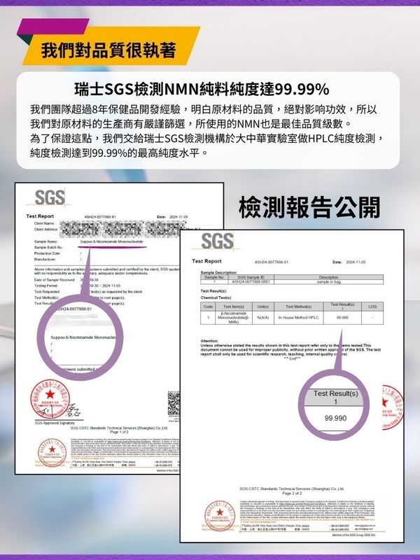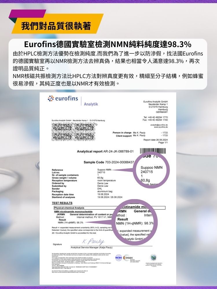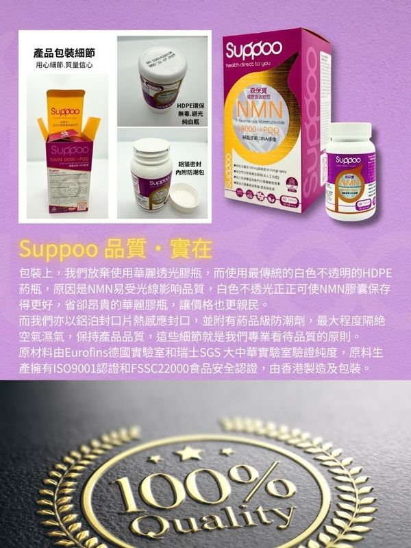 Suppoo森保寶 NMN18000+PQQ,採用先進生物發酵技術提取達99.9%純度高活性β-NMN,穩定性高、安全性好、無溶劑殘留、無化學合成原料,並由德國第三方獨立檢測機構Eurofins,用NMR和HPLC雙標準報告檢測純度,比其他品牌更嚴謹,(NMR以辨認真偽為目的.HPLC以純度為目的),暫時巿場上僅有我們提供這樣嚴謹的檢測。
