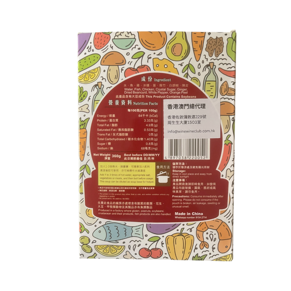 【成份】水、魚、雞、冰糖、薑、腐竹、白胡椒、陳皮