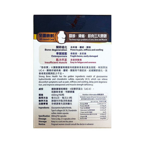 「勁骨寶」以鹽酸鹽葡萄糖胺和硫酸軟骨素的黃金搭配,特別添加UC-ll,顯著紓緩疼痛、僵硬、腫脹等不適症狀,改善並推遲關節退化、改善骨質疏鬆與肌力不足。