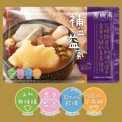 成份:水、花膠、淮山、蓮子、鐵皮石斛、金華火腿、紅棗、果皮、蜜棗、烏雞、鹽、薑