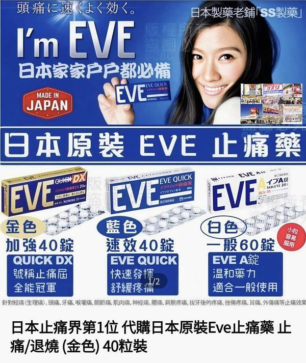 日本止痛界寶物首位 原裝Eve止痛藥 止痛/退燒 (金色) 40粒裝 (對於發高燒平均服下1天可立即退燒,止痛即服立即見效,女性經期痛症等等不息,有很好的效果,這含原廠專利配方)入口稀少,真貨難求