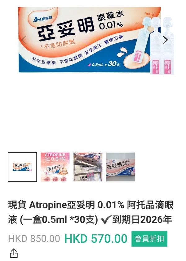 現貨Atropine亞妥明0.01% 阿托品滴眼液 (一盒0.5ml *30支) (保健品 中药 止咳化痰 维他命 降膽固醇 降血糖 糖尿病 痛風 滋補 失眠 頭痛 傷風 感冒 護眼 )