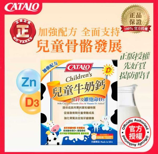 CATALO 兒童牛奶鈣加鋅及維他命D3成長配方100粒(屬保健品 中药 排毒 血管 流感 止痛 止咳化痰 維他命 血糖 痛風 失眠 傷風 感冒 發燒 護骨 老人 嬰兒 孕婦 兒童 免疫力 )
