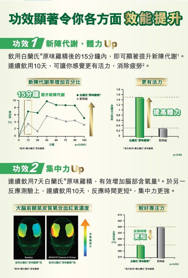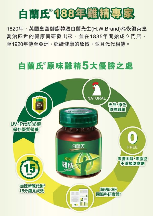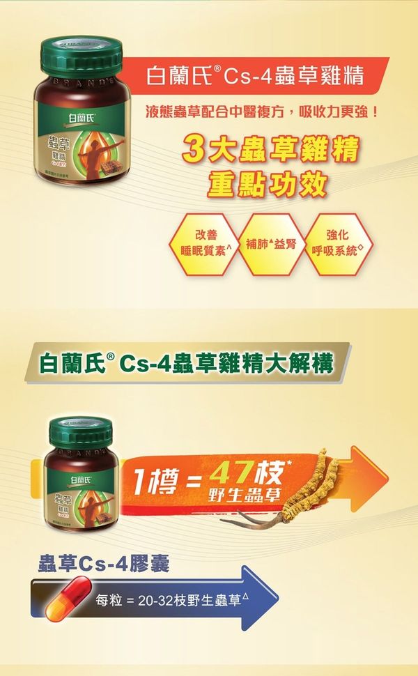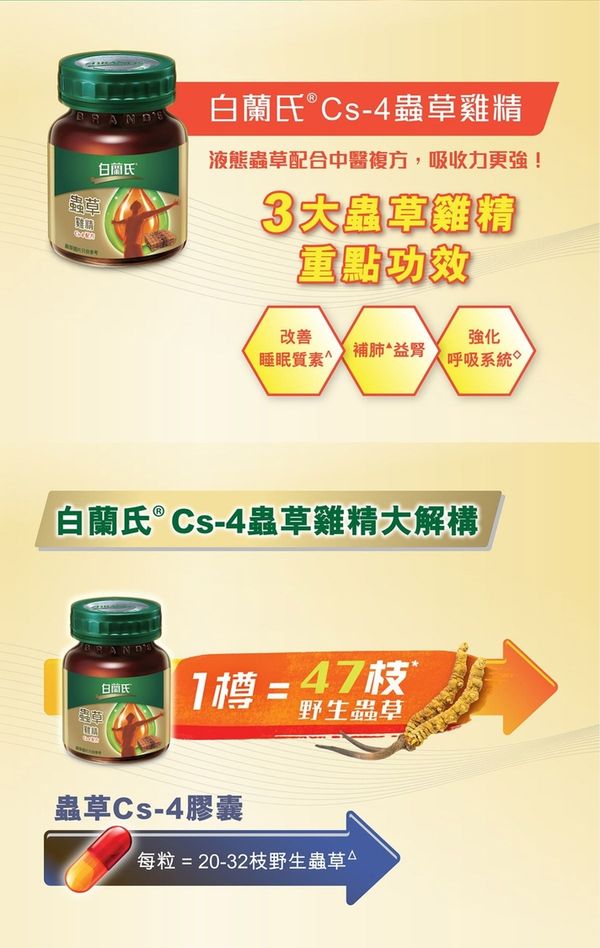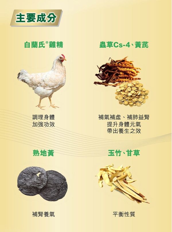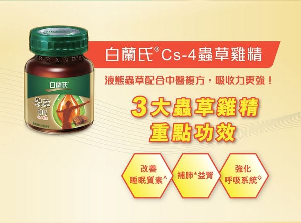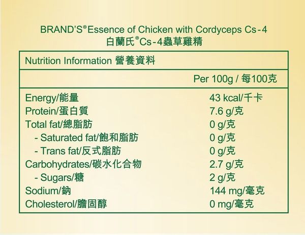 白蘭氏原味雞精憑藉188年經驗,獲超過50份科研實證改善健康,每樽白蘭氏原味雞精均選用上等無激素優質嫩雞,以高溫高壓清燉技術,萃取天然嫩雞精華,屬性溫和,不含脂肪、膽固醇、無添加人造色素及防腐劑。每樽揉合補肺益腎的Cs-4蟲草、雞精及多種補益藥材配製,補而不燥,容易吸收。成分有助補肺益腎,改善失眠,增強免疫力。白蘭氏Cs-4蟲草雞精適合需提升體力及集中力、增強免疫力及改善睡眠質素的人士飲用。