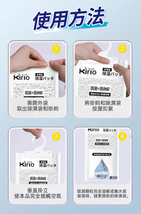 使用方法:打開外包裝,取出除濕袋及掛勾,檢視除濕袋有無破損,將掛勾與除濕袋扣合,並用於需除濕之場所即可。