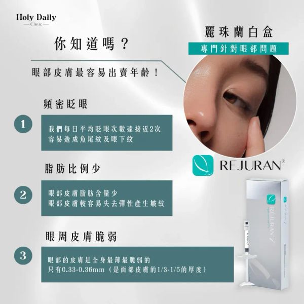 REJURAN 白盒並不只是表層保濕,而是一種「深層肌膚重建型水光療程」,透過促進膠原蛋白新生與微循環改善,逐步讓眼周恢復年輕彈性與光澤。