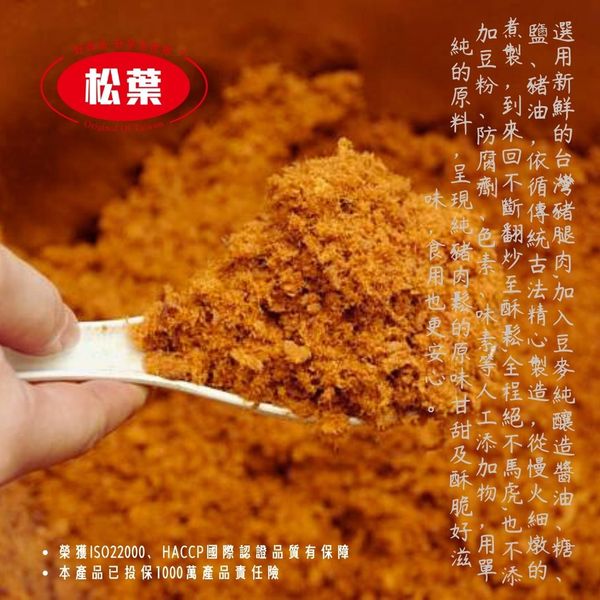 選用新鮮的台灣豬腿肉,加入豆麥純釀造醬油、糖、鹽、豬油,依循傳統古法精心製造,從慢火細燉的煮製,到來回不斷翻炒至酥鬆,全程絕不馬虎,也不添加豆粉、防腐劑、色素、味素等人工添加物,用單純的原料,呈現純豬肉鬆的原味甘甜及酥脆好滋味,食用也更安心。