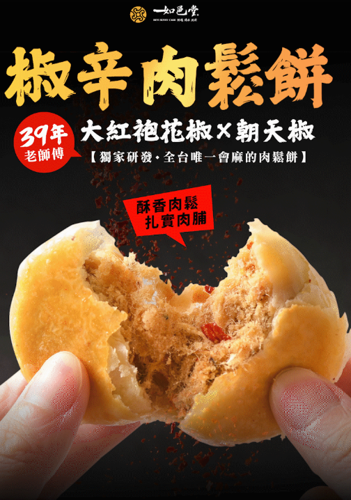 全台獨家微辣肉鬆餅,引頸期待肉鬆餅界的小辣椒,一顆高達50g的飽滿餡料,以花椒、大紅袍、朝天椒大火爆香再以八角提味,麻而不辣的酥香肉鬆餅,由如邑堂39年老師傅獨家研發,融入新鮮豬肉鬆與絲絲肉脯,一口咬下酥香麻陣陣撲鼻,微辣微麻的銷魂唰嘴滋味。