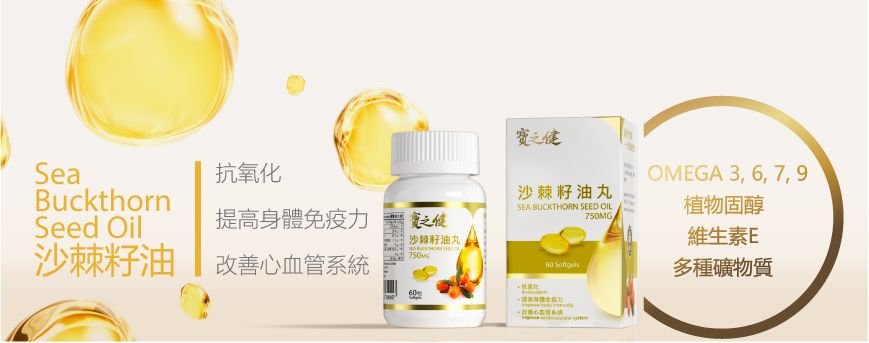 - 沙棘籽油含有OMEGA 3, 6, 7, 9,植物固醇, 維生素E, 多種礦物質等