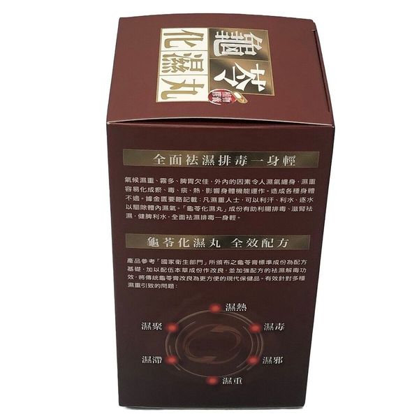 龜苓袪濕丸參考「國家衛生部門」所頒布之龜苓膏標準成份為配方基礎,加以配伍本草成份作改良,並加強配方的袪濕解毒功效,將傳統龜苓膏改良為更方便的現代保健品,並針對疲勞無神,胃滯肚谷、皮膚困擾、水肥脹胖、口臭牙痛和筋骨濕痛等都市問題。
