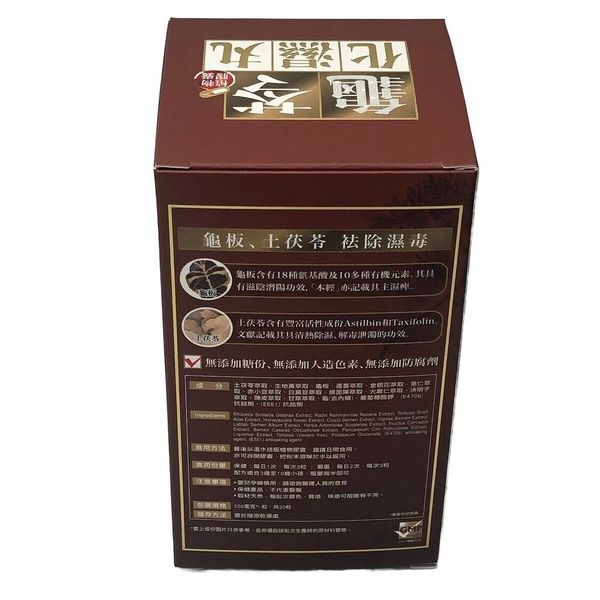 土茯苓萃取、生地黃萃取、龜板、金銀花萃取、薏仁萃取、赤小豆萃取、白扁豆萃取、綿茵陳萃取、蘆薈萃取、火麻仁萃取、決明子萃取、陳皮萃取、甘草萃取、龜(去內臟)、葡萄糖酸鉀、(E470b) 抗結劑、(E551) 抗結劑