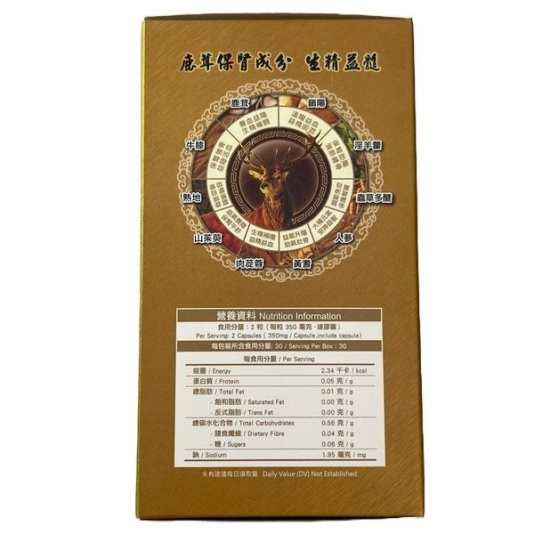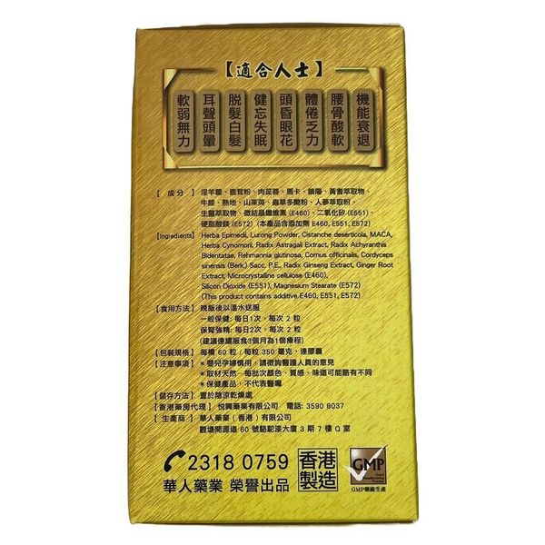 成份 : 淫羊藿,鹿茸粉,肉從蓉、馬卡、鎖陽、黃耆萃取物 、牛漆、熟地、山茱萸、蟲草多唐酚、人蔘萃取粉、生薑萃取物、微結晶纖維素 ( E460) 、二氧化矽( E551 )、硬脂酸鎂( 2572 ) (本產品含添加劑E460 , E551,E572)