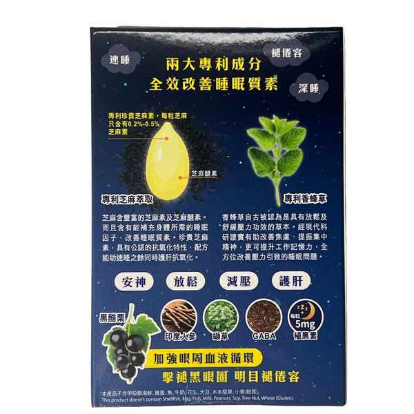 專利芝麻萃取-芝麻含豐富的芝麻素及芝麻醚素。而且含有能補充身體所需的睡眠因子,改善睡眠質素。珍貴芝麻素,具有公認的抗氧化特性,配方能助速睡之餘同時護肝抗氧化。
