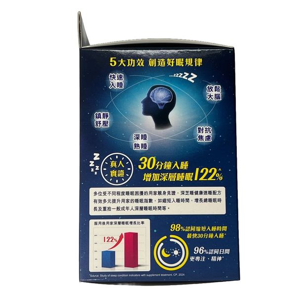 「深芝睡」結合多種天然睡眠草本,配合褪黑素而成的獨有健康速睡配方。睡前30分鐘服用,有效加速進入睡眠狀態,最快30分鐘入睡^;在睡眠過程中,「深芝睡」持續釋放專利草本助眠功效,放鬆肌肉,促進深層熟睡,令整個睡眠過程保持恬靜安寧,一覺瞓天光。