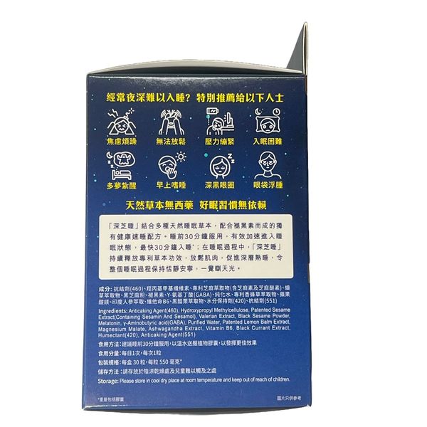 抗結劑(460)、羥丙基甲基纖維素、專利芝麻萃取物(含芝麻素及芝麻醚素)、纈草萃取物、黑芝麻粉、褪黑素、Y-氨基丁酸(GABA)、純化水、專利香蜂草萃取物、蘋果 酸鎂、印度人參萃取、維他命B6、黑醋栗萃取物、水分保持劑(420)、抗結劑(551)
