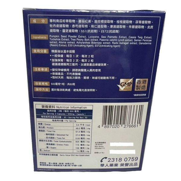 專利南瓜籽萃取物、蕃茄紅素、鋸棕櫚提取物、桂枝提取物、茯苓提取物、牡丹皮提取物、赤芍提取物、桃仁提取物、澤瀉提取物、牛膝提取物、北芪提取物、雷芝提取物、561(抗結劑)、E572(抗結)