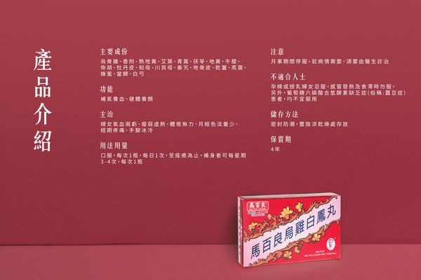 此丸配制精良,能調被困見時,使其氣血融和,無論婦女老少,若氣血兩虧、身體衰弱,皆宜服用,能健體養陰,調和氣血養顏。