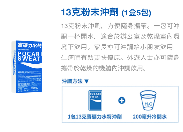 包裝規格13g(5包/盒) x 5產地印尼商品簡介.POCARI SWEAT 寶礦力水特粉劑 13克 x 5包/盒