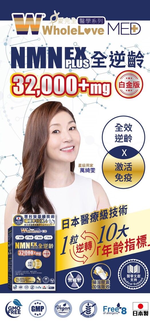 結合醫學文獻研究成果,與國際頂尖藥廠參考美國哈佛教授Dr. DavidSinclair配方,合力研發的【WholeLove MED NMN Ex+ 全逆齡白金版】,其獨特配方蘊含高濃度NMN 32000 +mg及專利NADH,10倍提升體內NAD +水平。特別别添加天然白藜蘆醇,貼近哈佛教授建議配方,揉合日本卓越製造技術,嚴格的質量管理。進一步啟動NAD +,高效強護激活細胞,全方位鞏固身體機能,強健大腦,改善睡眠質素,讓您重回年輕巔峰狀態,時刻保持活力,輕鬆迎接生活中各種挑戰。