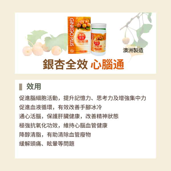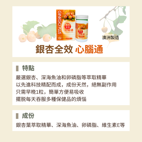 銀杏全效心腦通嚴選銀杏、深海魚油和卵磷脂等萃取精華,以先進科技精配而成,