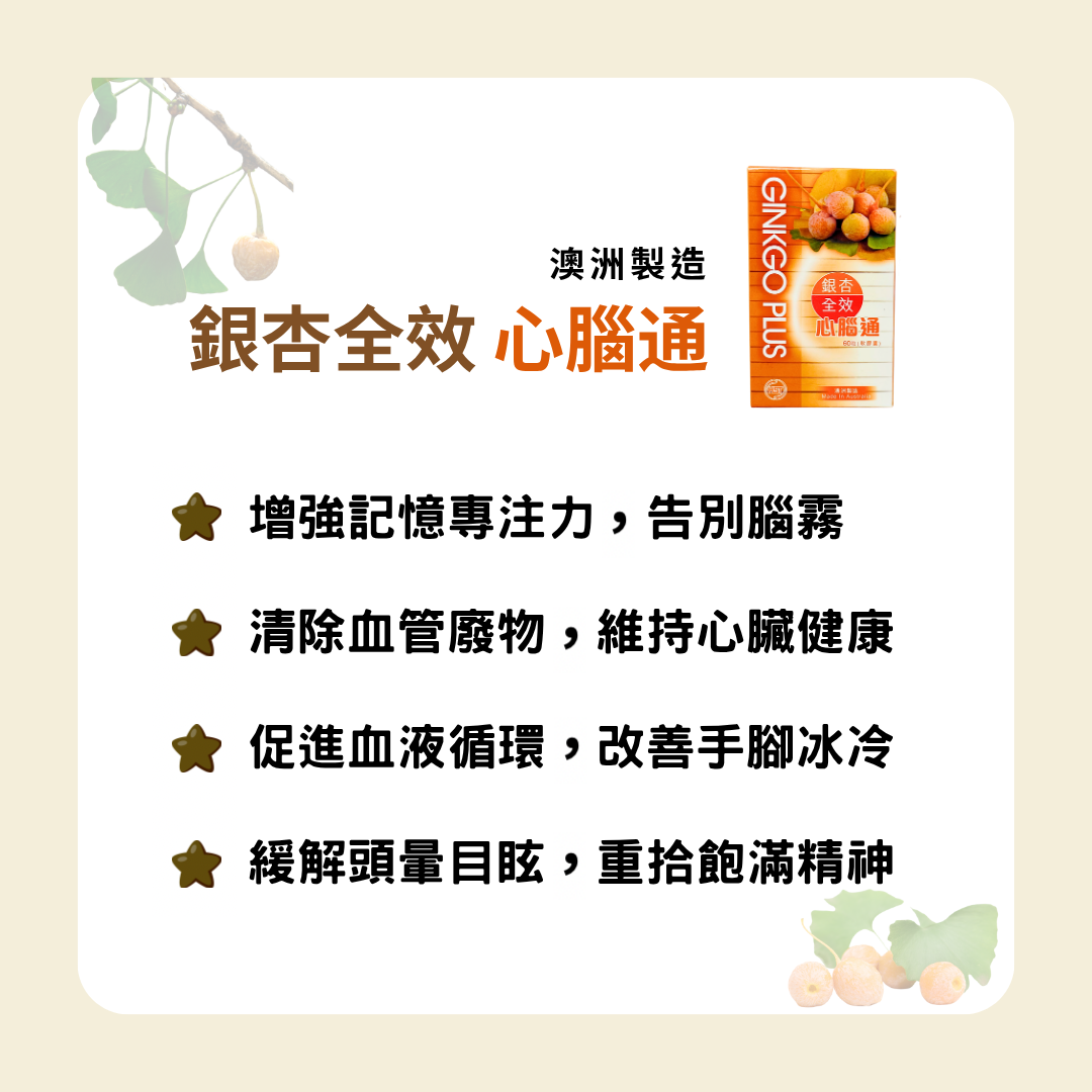 銀杏有助促進血液循環,增強記憶力和集中力、提供抗氧化功能、緩解眩暈。