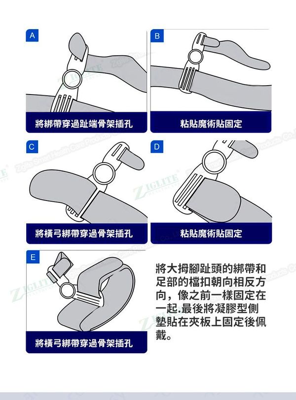 將綁帶穿過趾端骨架插孔,粘貼魔術貼固定,將橫弓綁帶穿過骨架插孔,粘貼魔術貼固定。
