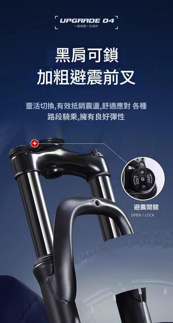 黑肩可鎖,加粗避震前叉。靈活切換,有效抵銷震盪,舒適應對 各種路段騎乘,擁有良好彈性