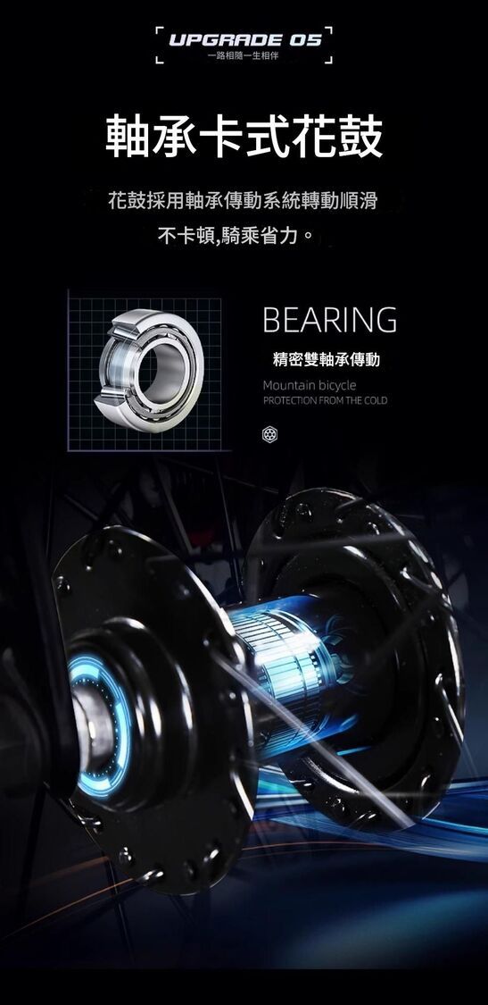 軸承卡式花鼓,花鼓採用軸承傳動系統轉動順滑不卡頓,騎乘省力。