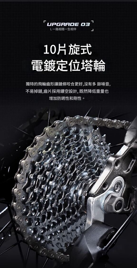 電鍍定位塔輪。獨特的飛輪齒形讓鏈條咬合更好,沒有多餘噪音,不易掉鏈,齒片採用鏤空設計,既然降低重量也增加防銹性和剛性。
