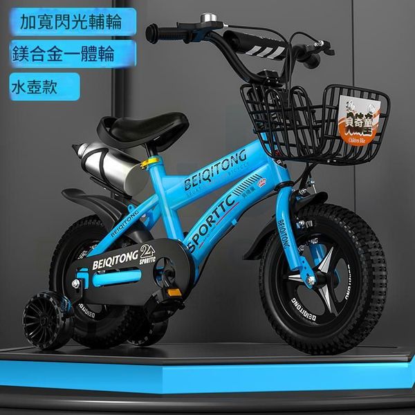東西物聚-兒童單車 14寸(身高90-105CM,约3-4歲) 尊享藍色[合金一體輪]+加寬暴君閃光輪+水壺+禮包 包安裝送貨-四輪車 帶輔助轆 小童單車 兒童自行車 生日禮物