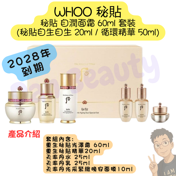 THE WHOO「秘貼抗老雙效套裝」通常包含多種皇牌產品,針對抗老修復與保濕滋養,組合如下: