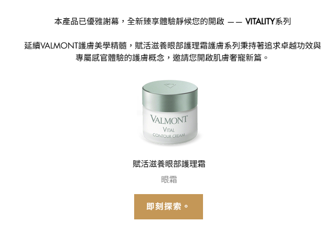 延續VALMONT護膚美學精髓,賦活滋養眼部護理霜護膚系列秉持著追求卓越功效與專屬感官體驗的護膚概念,邀請您開啟肌膚奢寵新篇。