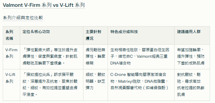 兩個系列可根據不同膚齡與針對性需求交替疊加使用,達致全面抗老與輪廓提升。品牌定位上,V-Firm 是「密度修護專家」;V-Lift 是「撫紋提拉專家」,二者聯用則可達到「彈性+平滑+拉提」的多重年輕效果