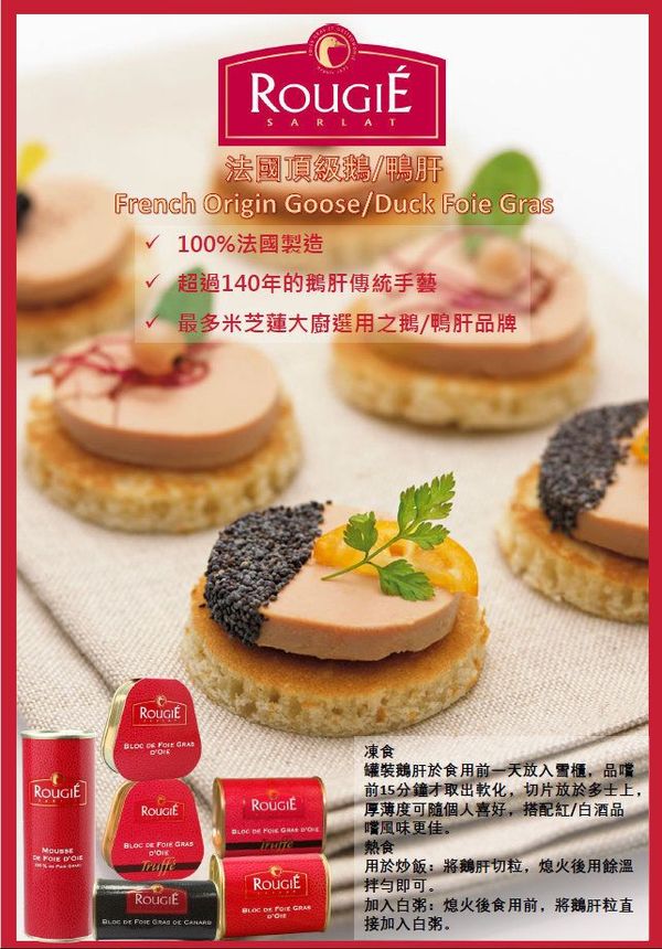 ROUGIE是法國市場的領導品牌,聲譽超卓,是最多米芝蓮廚師及著名食家選用之品牌。其鴨鵝由繁殖到取肝全由ROUGIE監控,ROUGIE有優質多產的母鴨/鵝,食物工廠,專屬的飼養員和農夫,更有3個符合世界衛生協議高性能屠宰場及兩個處理工場。