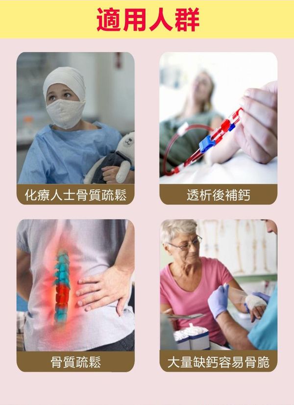 2、特別用於透析後低鈣引起的周身骨痛、骨質疏鬆、骨痛 、骨脆 、坐骨痛、骨變軟、骨受損等