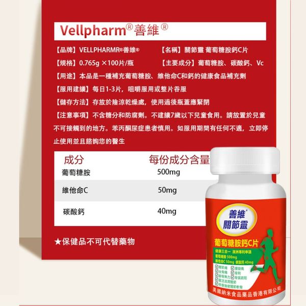 善維複方三合一葡萄糖胺鈣C片 每片含氨基葡萄糖鹽酸鹽500mg+碳酸鈣40mg+維他命C50mg。