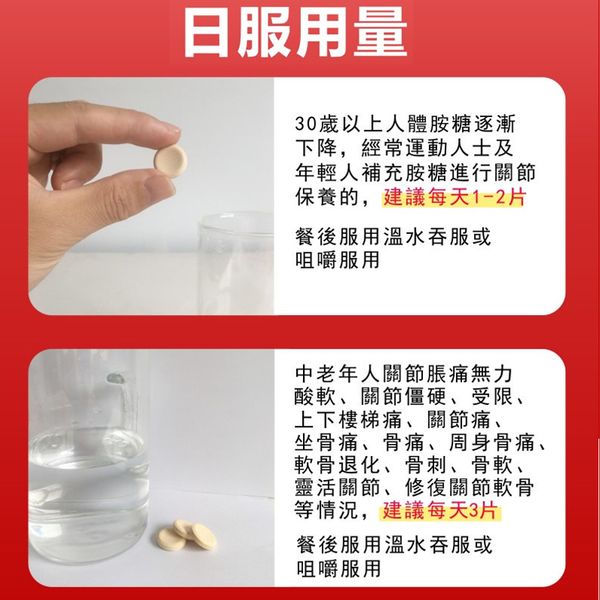 同時修復關節磨損軟骨、補骨、補維生素C增強免疫力,作用於全身關節,關節腫脹疼痛,走路及運動後關節痛,關節無力酸軟,起床關節僵硬、關節受限、上下樓梯痛,關節痛,坐骨痛,骨痛,軟骨退化,骨刺,骨軟,骨質增生,骨質疏鬆,舒緩痛楚、靈活關節,修復關節軟骨。碳酸鈣增加骨質密度令骨骼強健,維他命C可促進膠蛋白合成和抗氧化。