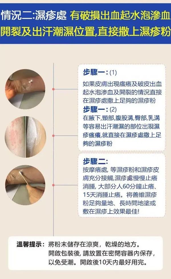 如果皮膚出現瘙癢及破皮出血起水泡滲血及開裂的情況,直接在濕疹處撒上足夠的濕疹靈粉。