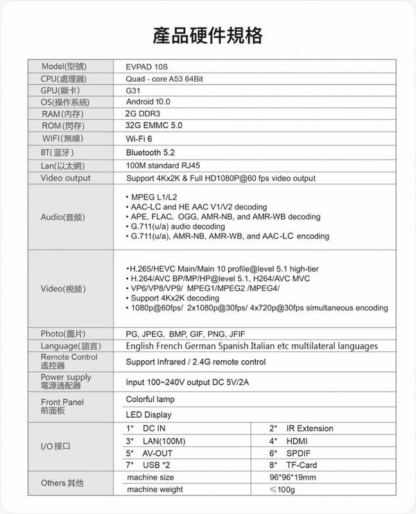 EVPAD 10S 2GB/32GB 全新十代旗艦智能語音視盒 配備人工智能語音功能、杜比視界5.1震撼視聽、WIFI 6技術、Android 10、2GB RAM + 32GB ROM eMMC儲存、藍牙5.2,且支援USB/SD卡槽