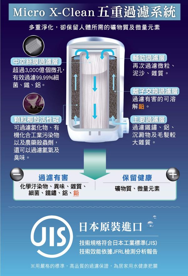 ◎五重過濾系統,可過濾氯氣、臭味、沉澱物、三鹵甲烷、揮發性有機化合物、殺蟲劑及寄生蟲