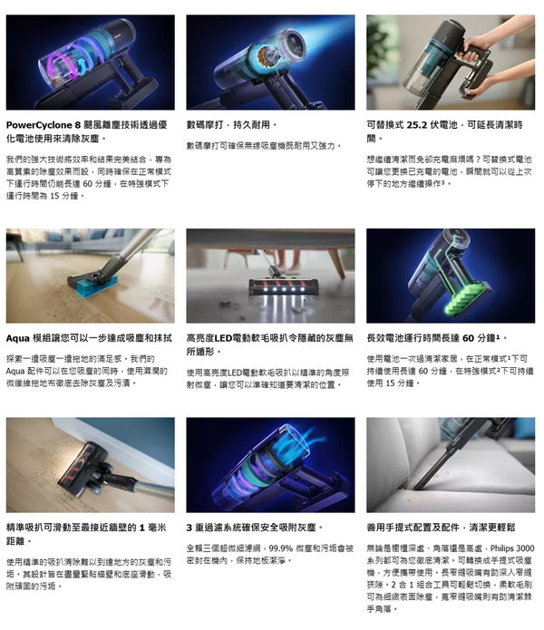 PowerCyclone 8 可在最佳利用電池的情況下去除灰塵。