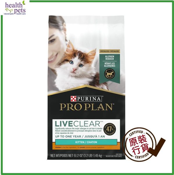 Pro Plan LiveClear 是一種革命性的貓糧,從每日餵食的第三週開始,貓毛和皮屑中的過敏原平均減少 47%。