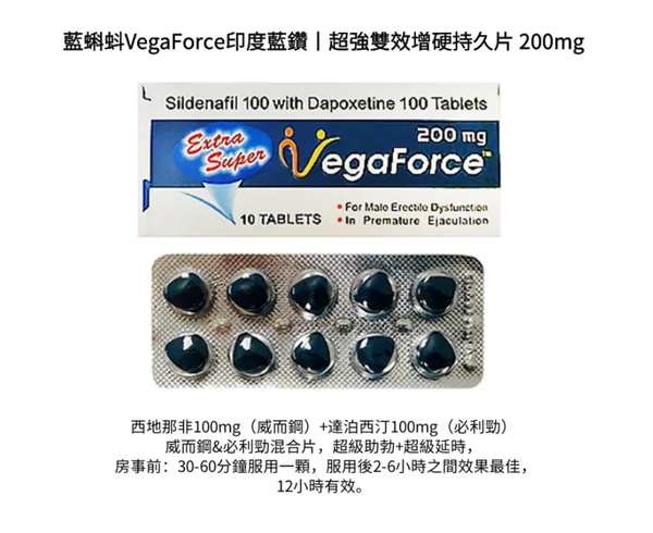 藍蝌蚪VegaForce是一種治療陽痿(ED)和早洩(PE)的藥物,它具有兩種不同成分的組合,可以同時作用於改善勃起功能和控制射精。具體來說,它包括西地那非(Sildenafil)和達泊西汀(Dapoxetine)這兩個成分,具有以下作用:
