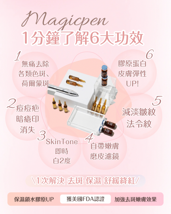 Magic Pen 經歐盟CE認證,利用極微小針刺方法,刺激皮膚膠原增生,同時促進皮膚自然癒合和修復,有效收細毛孔及淡化細紋。