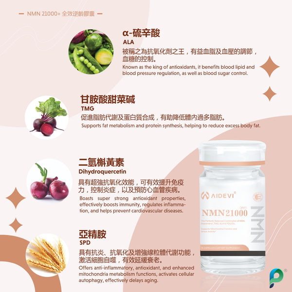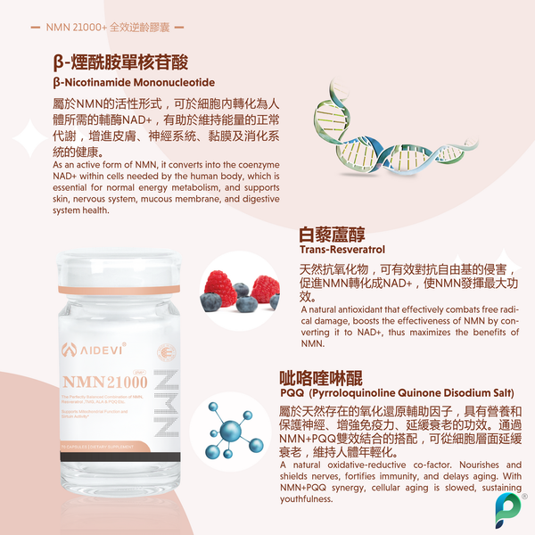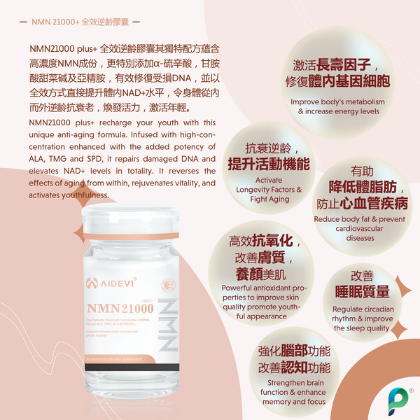 NMN21000 plus+ 全效逆齡膠囊其獨特配方蘊含高濃度NMN成份,更特別添加a-硫辛酸,甘胺酸甜菜碱及亞精胺,有效修復受損DNA,並以全效方式直接提升體內NAD+水平 ,令身體從內而外逆龄抗衰老 ,焕發活力,激活年輕。