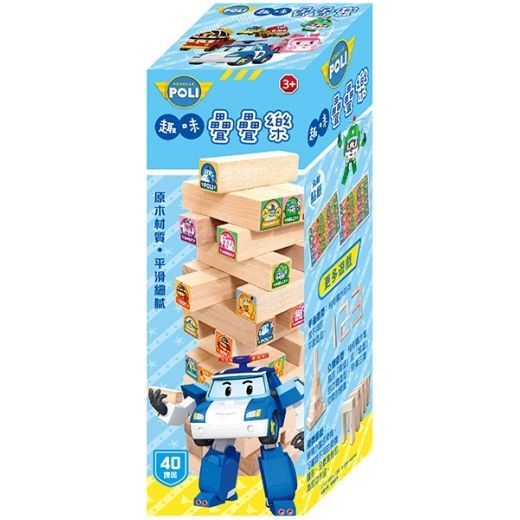 疊疊樂內容物:40塊木製積木與救援小英雄角色積木貼紙兩張。
