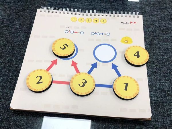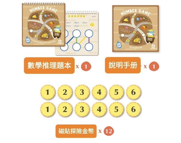 數學推理- (加法練習) : 請拿出數學推理題本, 挑選出與提示數字相同的探檢金幣, 觀察數學推理題本上的線狀圖形, 圓圈圈的數字總和會等於提示的數字。